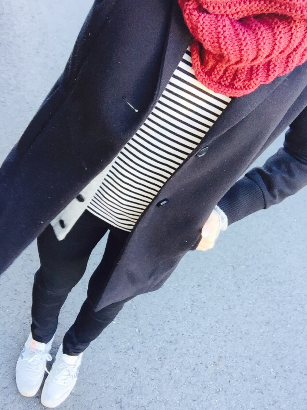 コートは一昨年購入品 暗いコーデは好き 黒が好き赤も好きボーダーも好き シンプルに スヌードのほうが楽なんだけど未だに変に巻いてる事が多いです