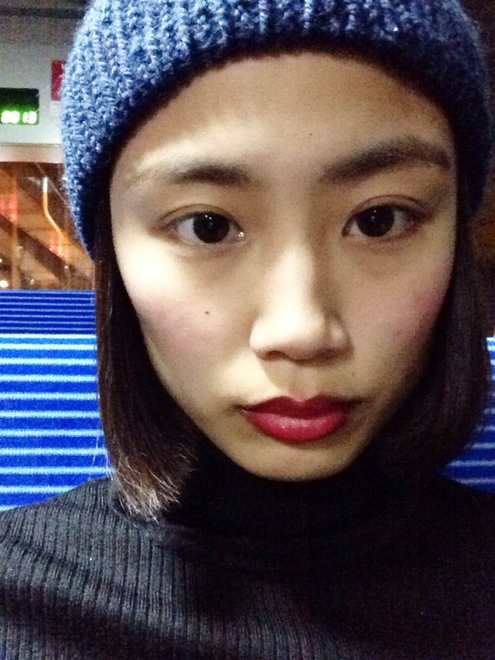 自分でつくったネイビーのニット帽です。 今日は化粧をしたつもりがしてなくて まさかのすっぴんでお出かけです(笑)