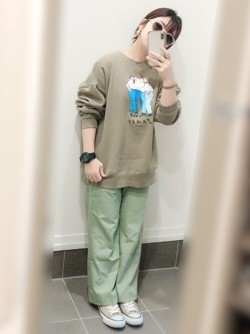 スウェットはベージュって書いてましたが、少しくすみグリーンよりのベージュ?って感じでした! 色味合わないかな?と思ったけど意外と?🤔 でも合わせ方のシルエットがいい感じのゆる感でいいかも??? パンツは綺麗にはきたかったので丈詰めました!!!