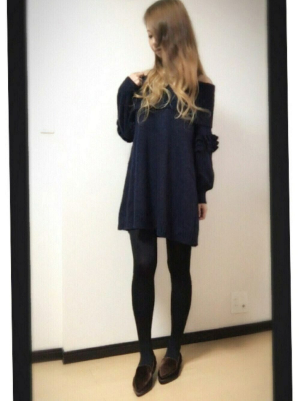 一目惚れニットワンピ♡ 赤か迷ったんだけど 無難なネイビーに行くところが まだ挑戦心が足りない私…笑 でもブラウンのシューズと合わせて 大人っぽく着れるからよしとしよう♪ オフィショルで着るのが可愛いけど もちろんそうじゃなくても大丈夫゚+.(・∀・)゚+.゚ 腕のフリルと形に特徴があって とにかく可愛い!笑 ブラウジングしてパンツに合わせるのも よさそうなので今度やってみよー(ノ∀`)