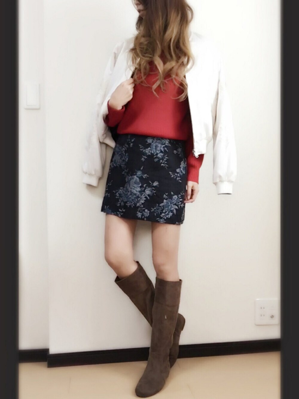 真っ赤なニットを主張させすぎず かつ主役になれる様に考えてみました♡ もおすぐクリスマスだしねー笑 タイトのミニは大判の お花刺繍入り♡ ニーハイよりバランス取れたので ミドルブーツにして 黒だときついからキャメル(✿´ ꒳ ` )ノ