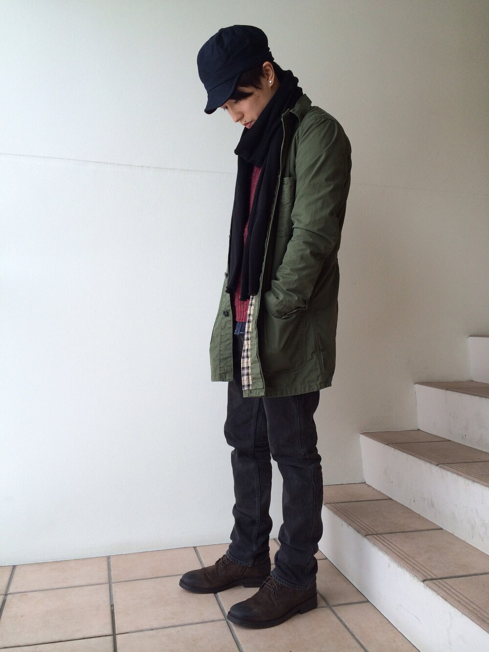 コーディネートイメージは大人の休日。笑 一見シックな印象ですが、ニットの素材感や裏地のチェック柄など温もり感を与えて決まり過ぎないよう意識しています。