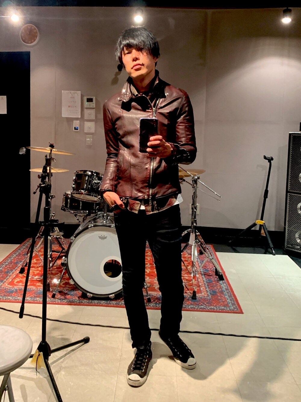 2020.12.2 外気温9度 またTシャツにシャツにライダースで寒くない。 ライダースの色とシャツの色が合うね。 ちなみにインナーは自身のバンドの物販T着てます。