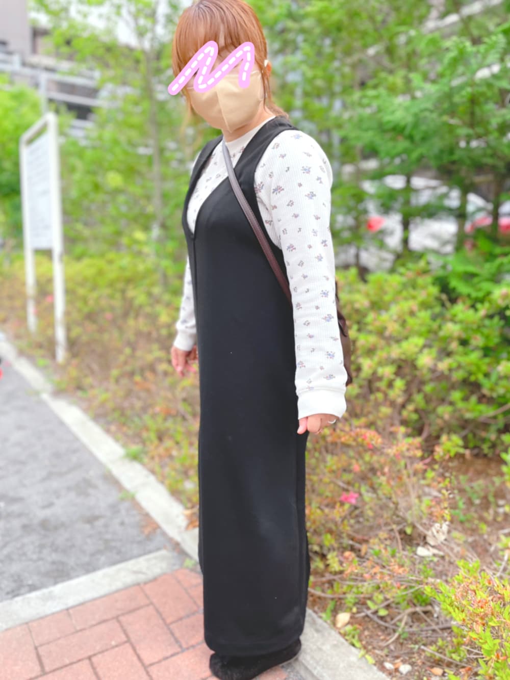 この日は、ワンマイル公園コーディネート🍃✨ ジャンスカに、小花柄のワッフルクールネックTを合わせてレトロカジュアルな印象に♪♪ この後、娘によじ登られ、ジャンスカがあしあとだらけに👣💦 えーん😂