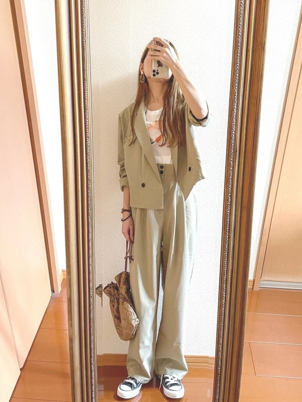 ecrireさんの定番セットアップ♩ カーキです♩ ベージュよりの優しいカーキでアッシュ系の髪色によく合います♩ 季節問わず着られるお色でお気に入り♩スニーカーでカジュアルダウン Instagram ➡︎lupinus0527