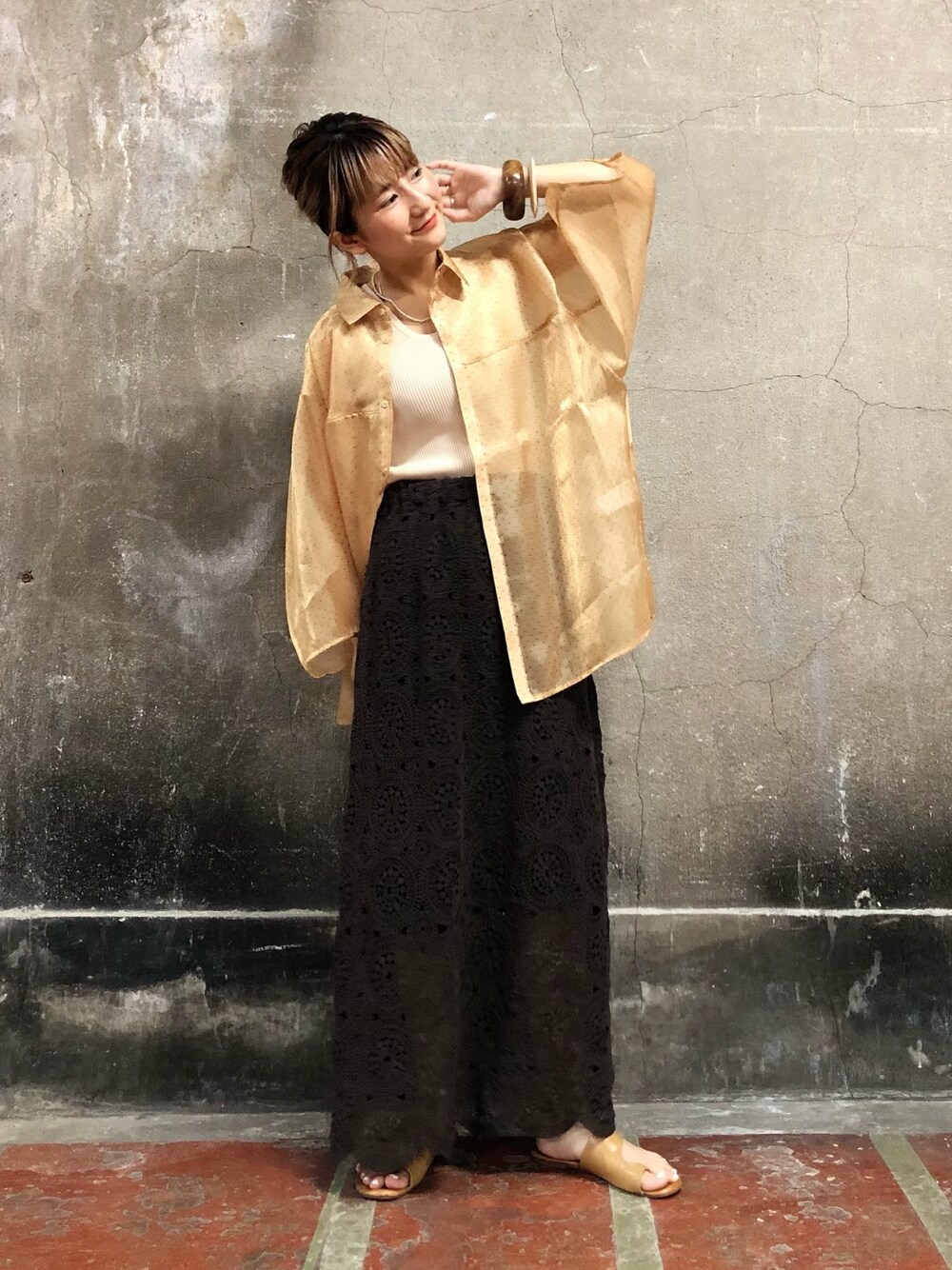 ドットのシースルーシャツ🧍🏻♀️ 光沢感があってかわいらしいデザインだけど、メンズっぽいサイズのギャップが👌🏻❤️🔥 レースのスカートもペチコートが膝丈なので実際履いてみるとぬけ感が出てスッキリします!!