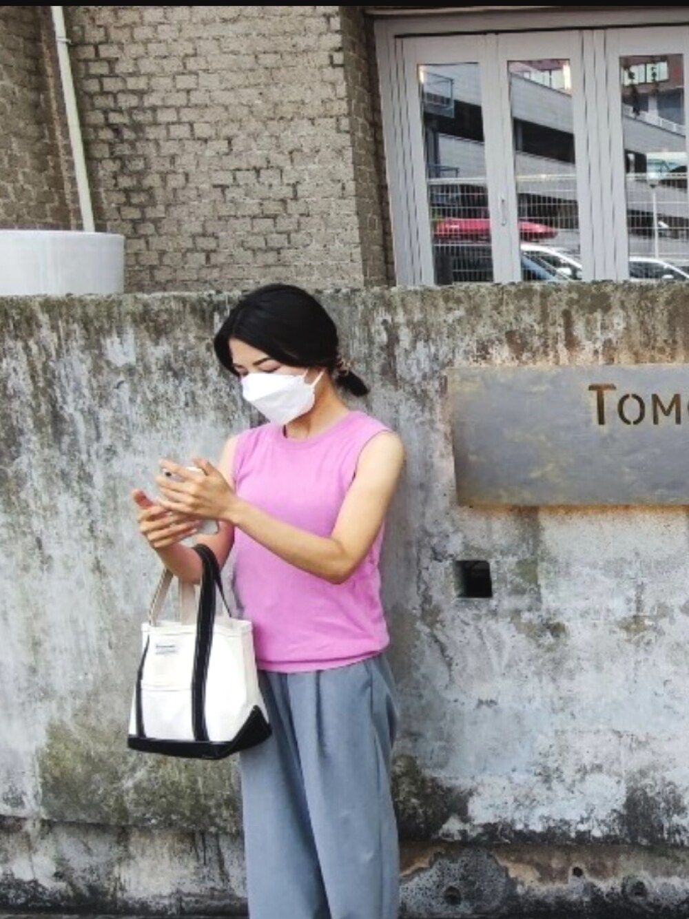 真夏日の一枚。 元気がない日はあえてビビットカラー着て、気持ち高める。 トートは単体で自立してくれるのですごく楽です。2代目探さなきゃ