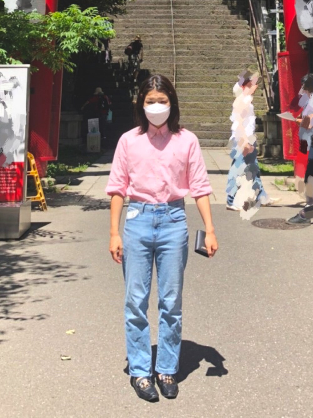 今夏の古着ミックスコーデ。 ピンクの半袖ポロシャツ に一目惚れした。 ボタン全留とウエストインにローファーでかっちり着てるけど、シルエットと色味で柔らかさが残る(気がする) 神社の前ってどういうポーズで写ったらいいの?からの直立不動。