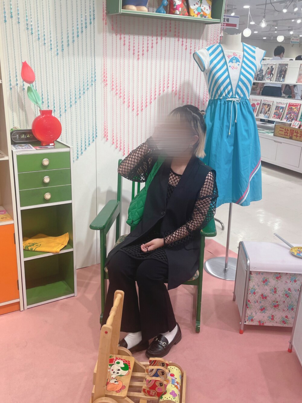 昭和レトロな所で📷 このジレとメッシュの組み合わせが鬼かわいい👹💖 秋はシースルートップスと合わせたいな〜⋆͛♡⋆͛ 今日はブーツじゃなくてローファーでした👞 ブラックコーデがかっこよくて好き🪩