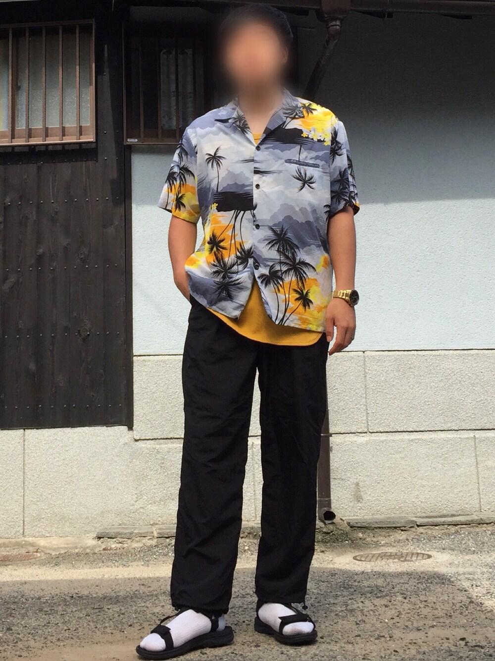 ブルー系のシャツ/ブラウス、ブラック系のスラックス、ホワイト系のサンダルを着用したメンズの夏コーディネートの1枚目の写真