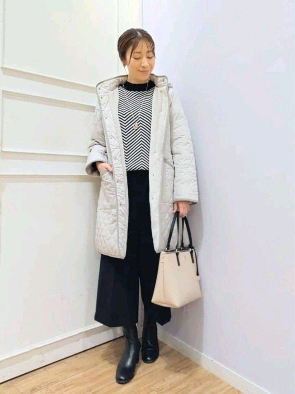【サイズ感】 *ダイヤ柄キルトアウターはスッキリ目の シルエットで、太ももが隠れる程の着丈です。 【素材感・着心地】 *アウターは中綿が入ったあたたか素材で 撥水加工されています。 *パンツは起毛されたあたたか素材で、後ろ だけゴム仕様の着心地楽ちんタイプです。 【おすすめポイント】 *アウターはフードが取り外し可能な2wayで 着られる商品です。ファスナーで簡単にフード を外すことができ、その日の気分やスタイリ ングで替えるのも◎ 袖口にフェイクファーがついていて、暖かく て嬉しいポイントです。 【スタイリングポイント】 キレイ目オフィススタイリング。 ダウンよりもボリュームを抑えたキルト アウターは通勤着としても大活躍です。