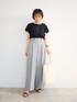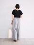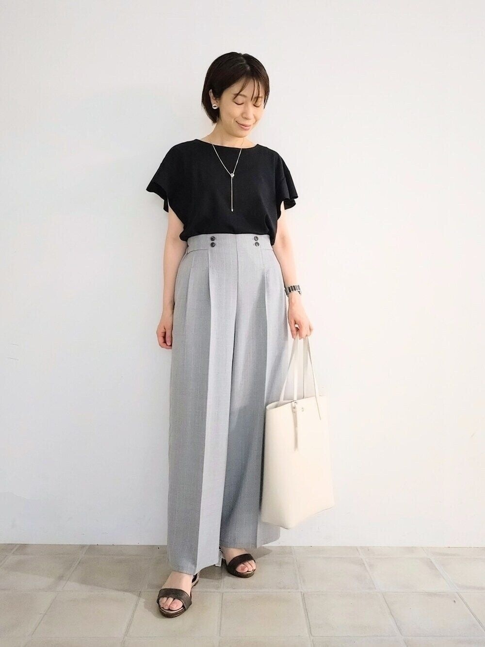 【素材感・着心地】 *フリルスリーブTシャツはさらっとして いるだけでなく、汗をかいても気になりにく い汗ジミ防止素材です。さらき夏に嬉しい UVカット&接触冷感機能付きです。 【サイズ感】 *パンツはセンタープレス入りのワイド デザインです。身長157cmでMサイズを 着用。ヒールなしのシューズでもバランス◎ 【おすすめポイント】 *パンツはさらっとした麻調ストライプの 生地です。程良い落ち感と清涼感があり ます。トップスインした時にウエストの フロントボタンがアクセントに。 【スタイリングポイント】 通勤&オフィスコーデ☆ 参観日や三者面談など学校行事にもおすすめ のキレイ目コーデです。
