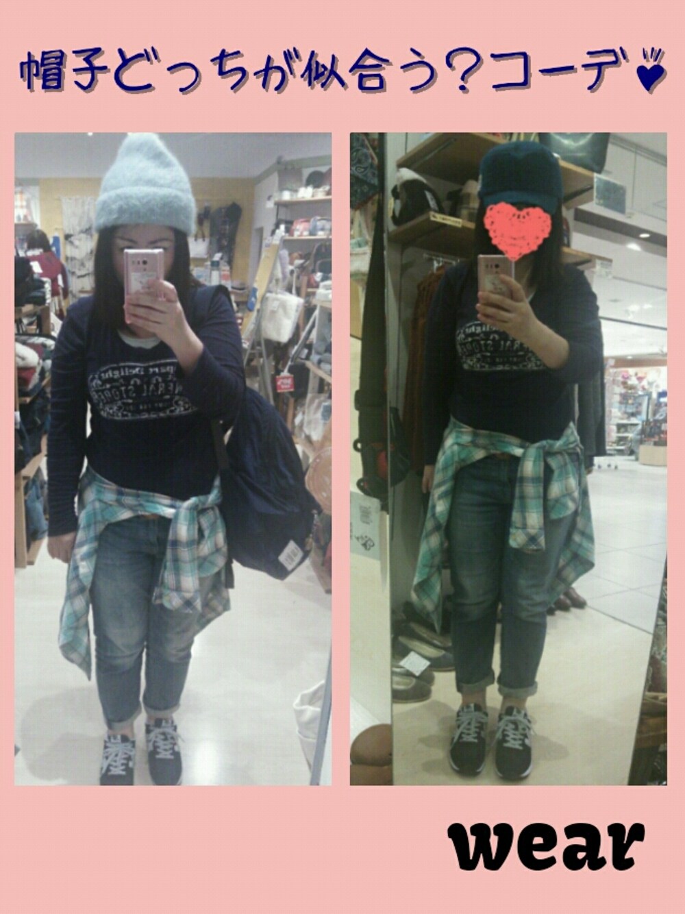 こんばんはー!! 暑い週末、あっという間の2日間でした。 いつも、覗いていただき、いいね、saveありがとうございます♪ 秋コーデ、帽子どっちが似合うかわからなくての投稿です。 店内、セルフィー写真で見苦しくてごめんなさい…(;^_^A 良かったら、どっちが似合っているか、コメントで教えていただきたく、よろしくお願いします♡ 週末、ロンT3枚まとめ買いしちゃいました!!ロゴ色ち2枚とボーダー1枚♪ チェックシャツ感謝祭フェス♪あるみたいで、楽しみです!!(*^.^*)!! また1週間、秋コーデで楽しみましょう♪♪♪