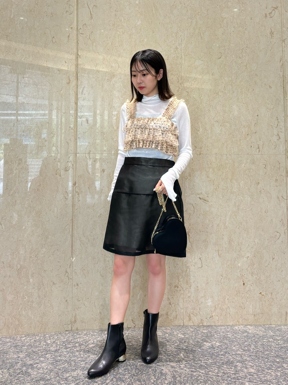 【スター&ハート柄チュールフリルビスチェ】 ショート丈で締め付け感などもないため、着心地が良いです! 細かいハート柄とフリルが特徴的で、普段のコーデにプラスするだけでオシャレ度アップです♥ 【シアーレイヤードサテンミニスカート】 丈が短すぎないので、大人でも履きやすいミニスカートです◎ シアー素材とサテン素材が重なっていて大人っぽくパンツの上にレイヤードするのもオススメです! 【バックストレッチショートブーツ】 クッション性があり、ストレスなく履きやすい印象です! 八角形のメタルヒールがアクセントとなって、シンプルなコーデも引き立ててくれます★