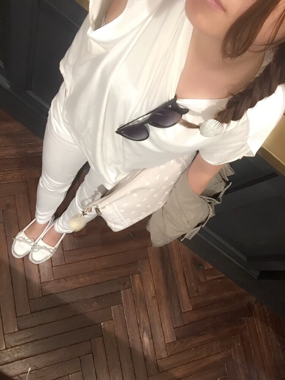 トレンドのオールホワイトに挿し色カーキのミリタリージャケット☆ フィッシュボーンも気に入って毎日してます。笑