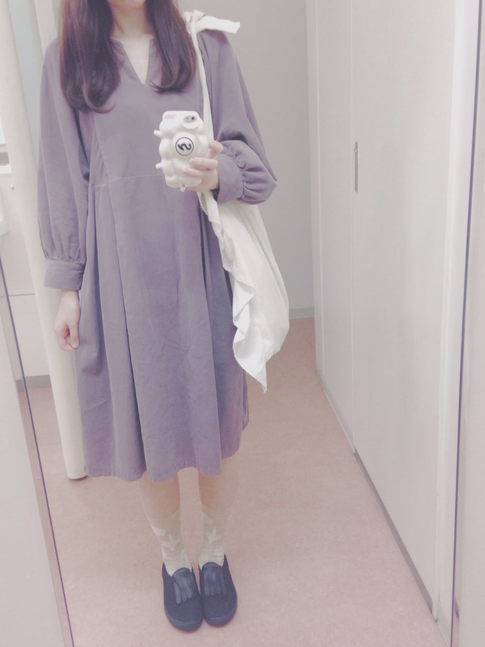 すっかり涼しくなったのでさっそく秋服を着ました 🍂 ワンピース、ゆったりとしたかたちが寝巻きみたいでかわいいです。 bulle de savonのフリンジがついたスリッポンとROROの靴下との相性もよき ◎