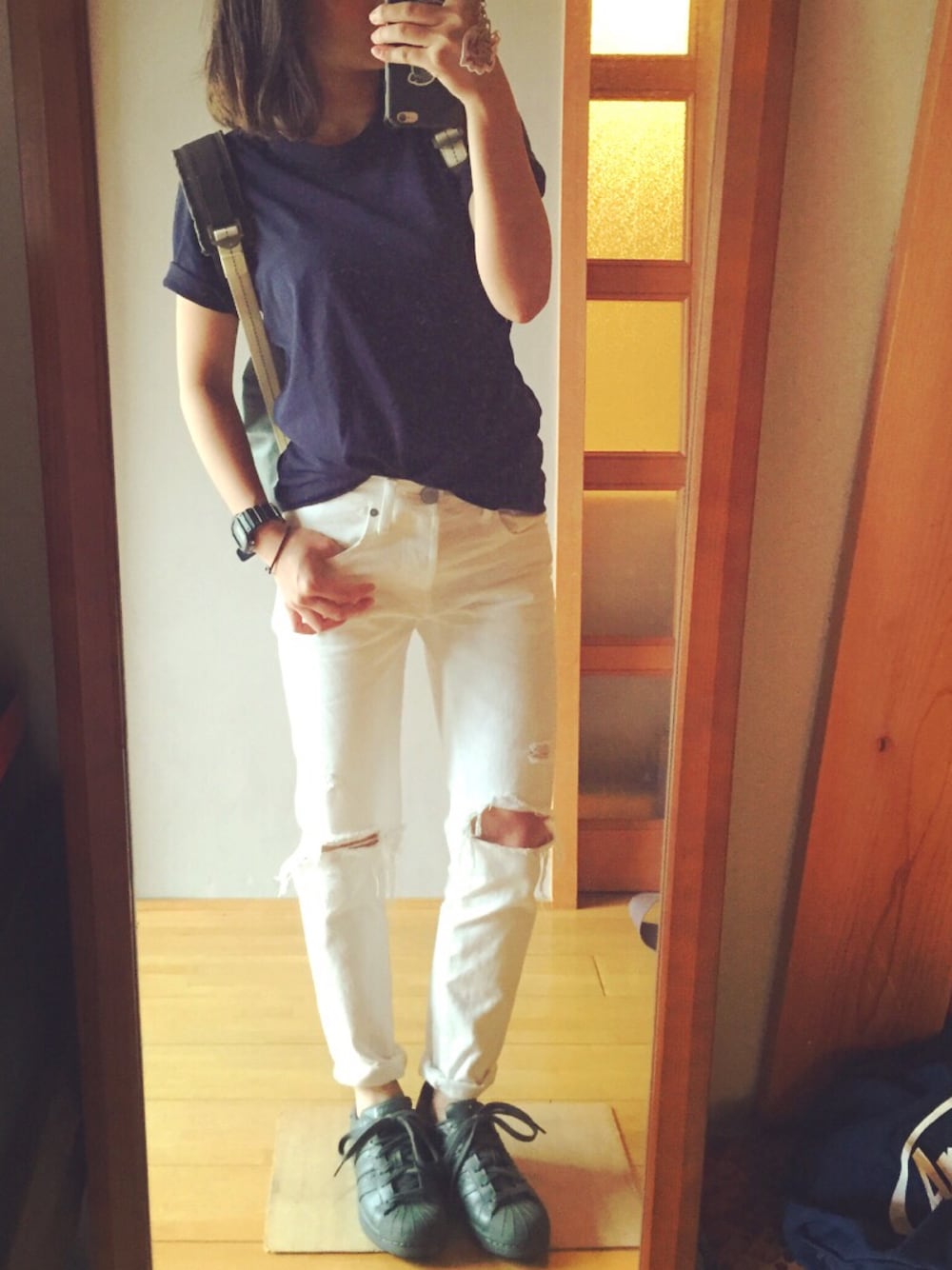 とっぷすを入れすぎた〜笑 カーキシャツ羽織りました とっぷすわパックTのネイビー ネイビー×カーキすき 朝急ぎすぎて、髪の毛半分しか 乾かせなかった。さみ〜〜〜( ´ ω ` ) 太ももキツすぎるだろ! 筋肉痛し。