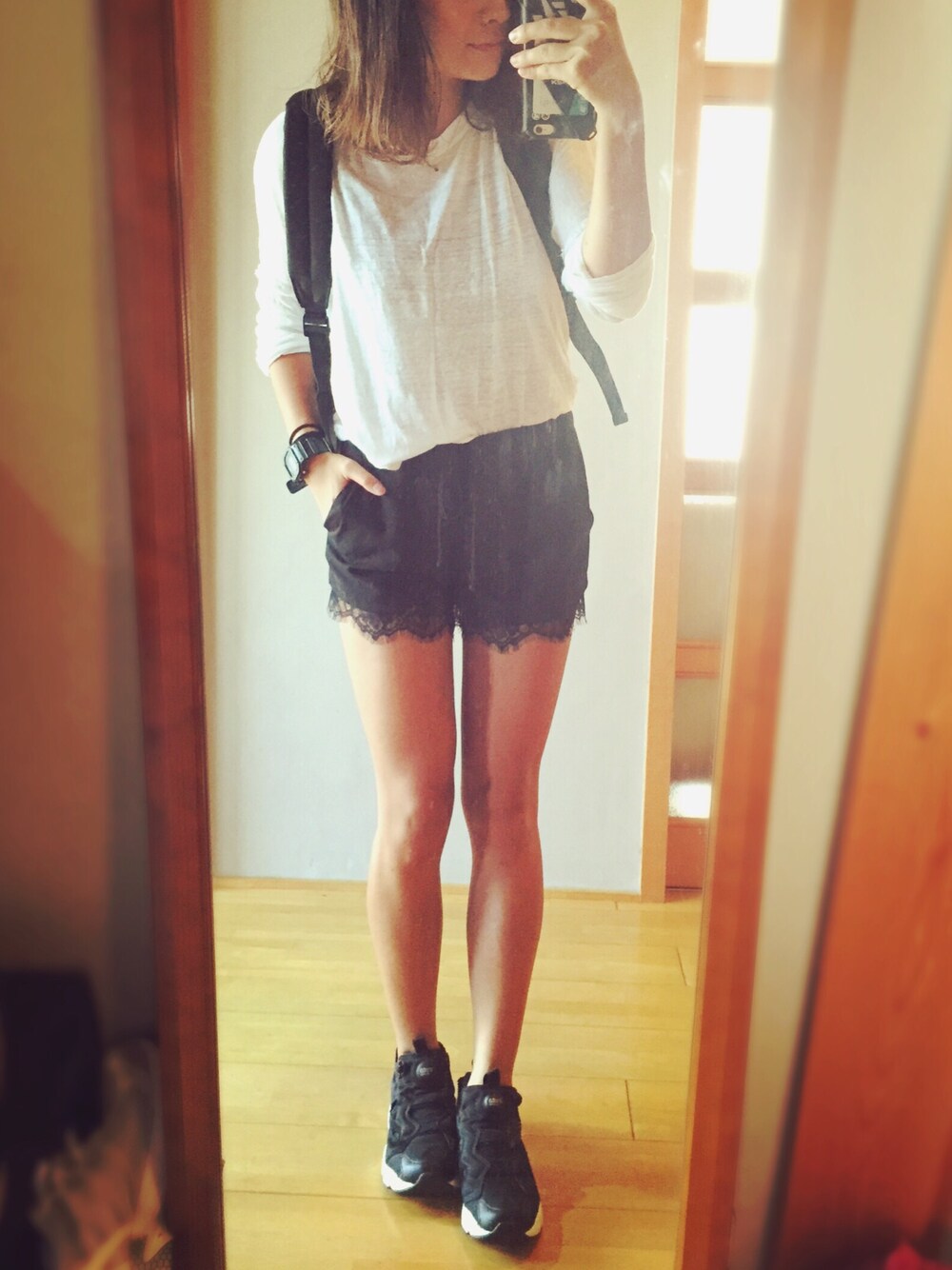 このひらひらパンツ! らしくない!! から、スニーカーにリュック! いつもどーり(^ω^)(^ω^) 金曜だよーーー!! あーひらひらかわいい(笑)