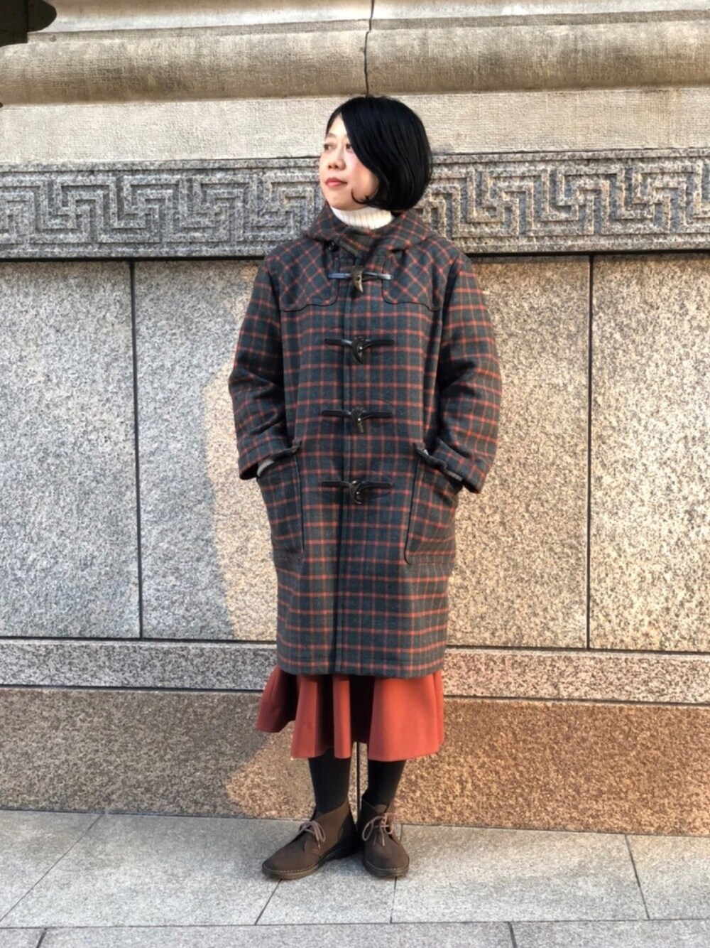 チェックのダッフルコートを主役にブラウン系でまとめて。