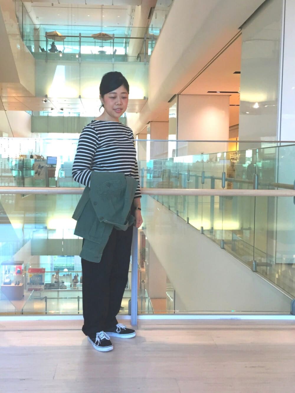 BLACKでカラーを統一すれば、カジュアルなイメージのボーダーとミリタリーアイテムを合わせてもまとまります。