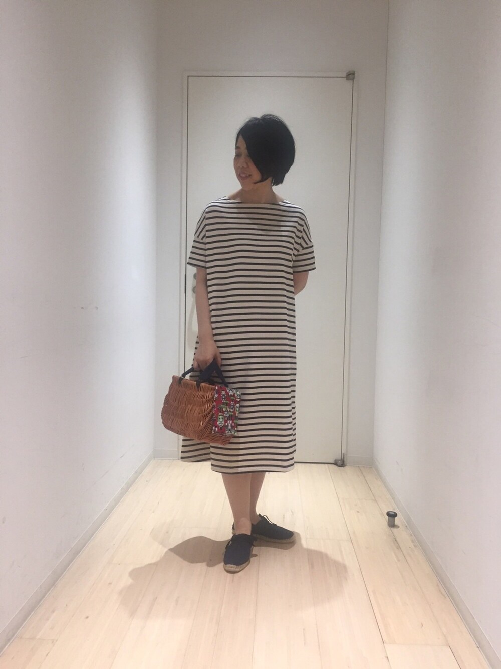 オフショルダーのAラインワンピースは着丈も長いので高身長の方でも1枚で着ていただけます。 お気に入りのカゴバックを合わせて、初夏のお出かけスタイルに。