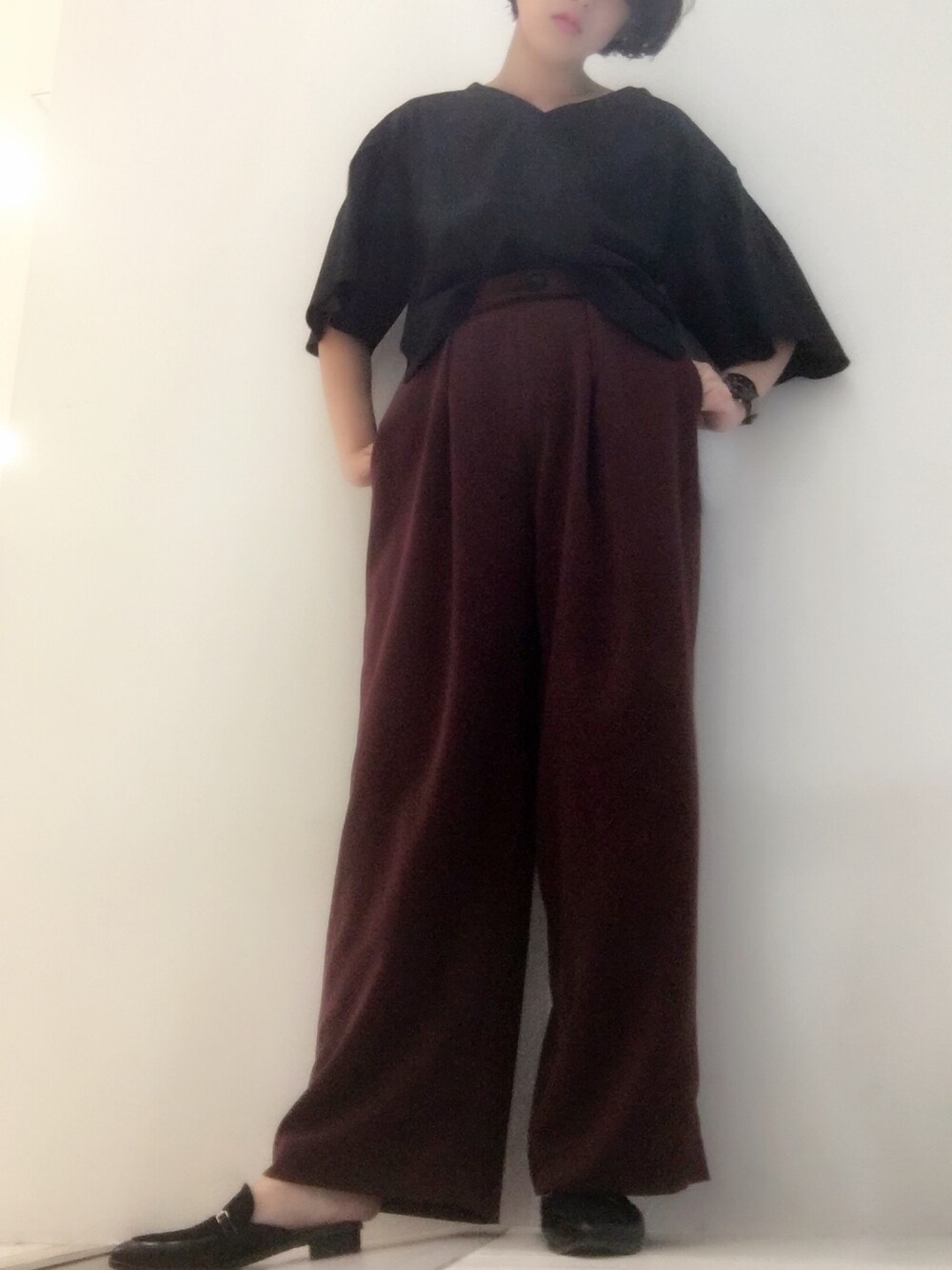 少しずつ秋に使えるアイテムを取り入れていくには、5部丈袖オススメです。 秋色のバーガンディのパンツはセットアップでTOPSもありますよ🙆