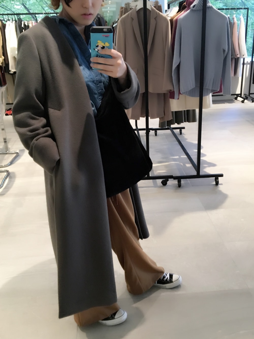 CITYのノーカラーコートは、たっぷり中に着込めそう! 軽いから抱っこ紐して、その上から羽織るのも今後良さそうな予感です🙆