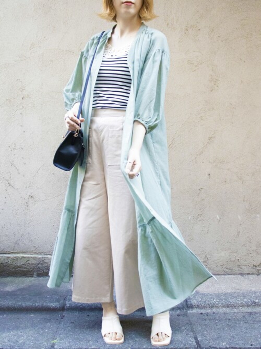 悪天候が続く梅雨でも明るいカラー、透け感のある素材で爽やかな1着♥︎︎ シャツでもワンピでも大活躍◎ ボーダーのトップスや黒のショルダーバッグでメリハリのある合わせですが柔らかい色味の優しいコーデです!