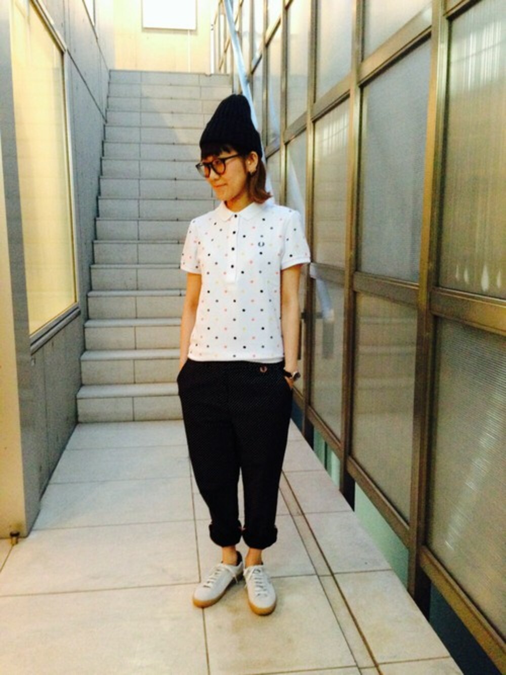 メンズライクなコーディネート。ポロシャツにはカラフルなドットが散りばめられていてポップな 印象をボトムスで締めました。ガーリーにも使えてメンズっぽくも着れる万能アイテムです。 シューズは新作商品。生成り地にグリーンのカラーが◎です!