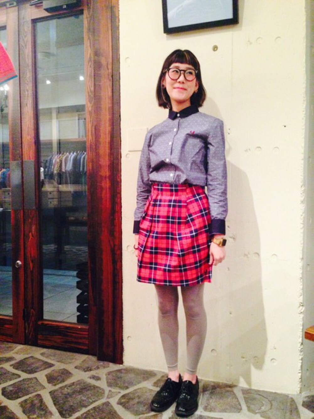 学生風コーディネート。 今年の新作クレリックシャツはドット柄。タータンチェックのスカートを合わせてプレッピーに。