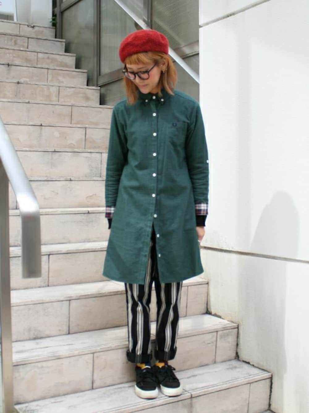 フランネル素材のシャツワンピースをロングシャツとして着てみました。 赤のベレーは被りやすいのでアクセントとして最高です。