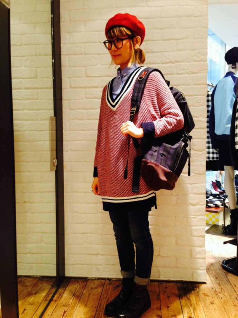 大きめのチルデンニットはお尻が隠れるのでワンピースとして使えます。 トリコロールなのでデニムとも相性抜群です。 スキーニーパンツやタイツと合わせてもGOOD!! Yシャツと重ねるとトラッドな印象になります。