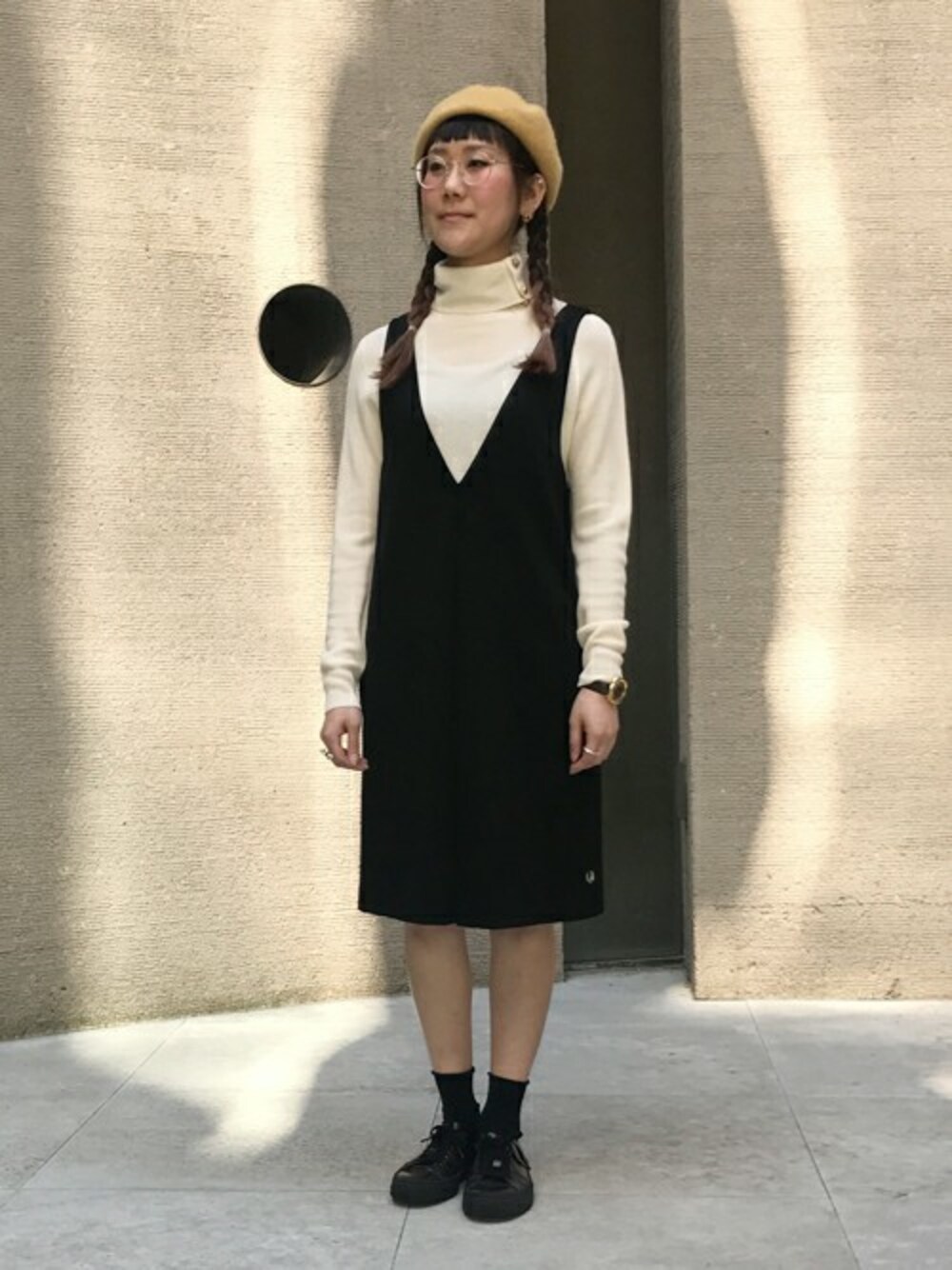 深くVの開いたジャンバースカートはタートルと合わせるのがおすすめです。