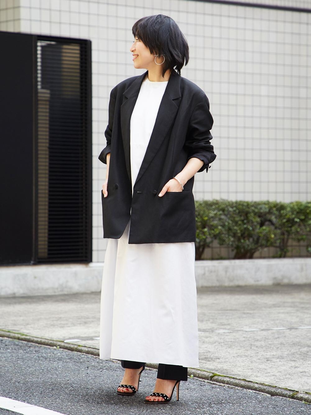 ビッグシルエットが特徴のタキシードジャケットは、春先のアウターとして個人的に大活躍しています。シルクリネン素材はドレッシーになり過ぎず、ほどよくカジュアルダウン出来ます。インナーには、襟付きのシャツをあわせたり、マキシ丈のワンピースをあわせたり、パンツをあわせたりとさまざまですが、足元はピンヒールのサンダルで女性らしさを意識したコーディネートを楽しんでいます。 ・ジャケット<UNITED ARROWS>:¥70,200[1522-209-0707] ・サンダル<GIANVITO ROSSI>:¥117,720[1731-499-6977]