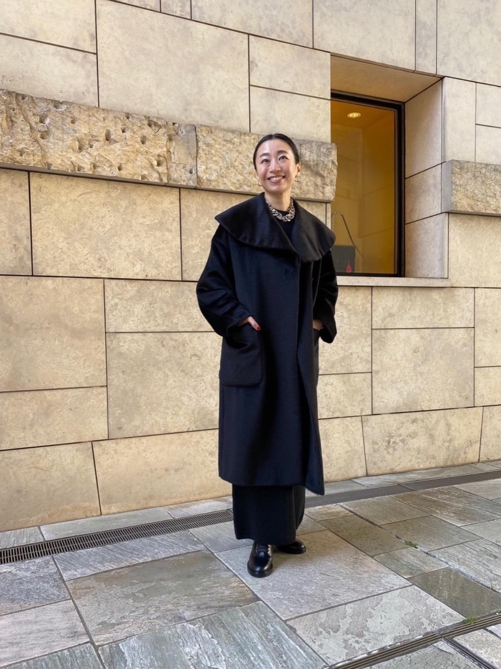 トレンドの大きな襟もブラックコーデともなれば甘さが抜けてスッキリ辛口な印象に。ブーツの金具に合わせ、アクセサリーもシルバーで統一しました。