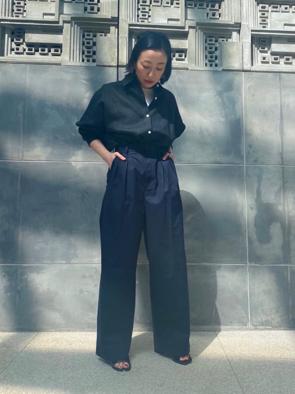 今回はオーバーサイズのリネンシャツにタックが特徴のワイドパンツを合わせ、メンズライクなスタイリングに。コーディネートのアクセントにシルバーアクセとTABIミュールを用いました。