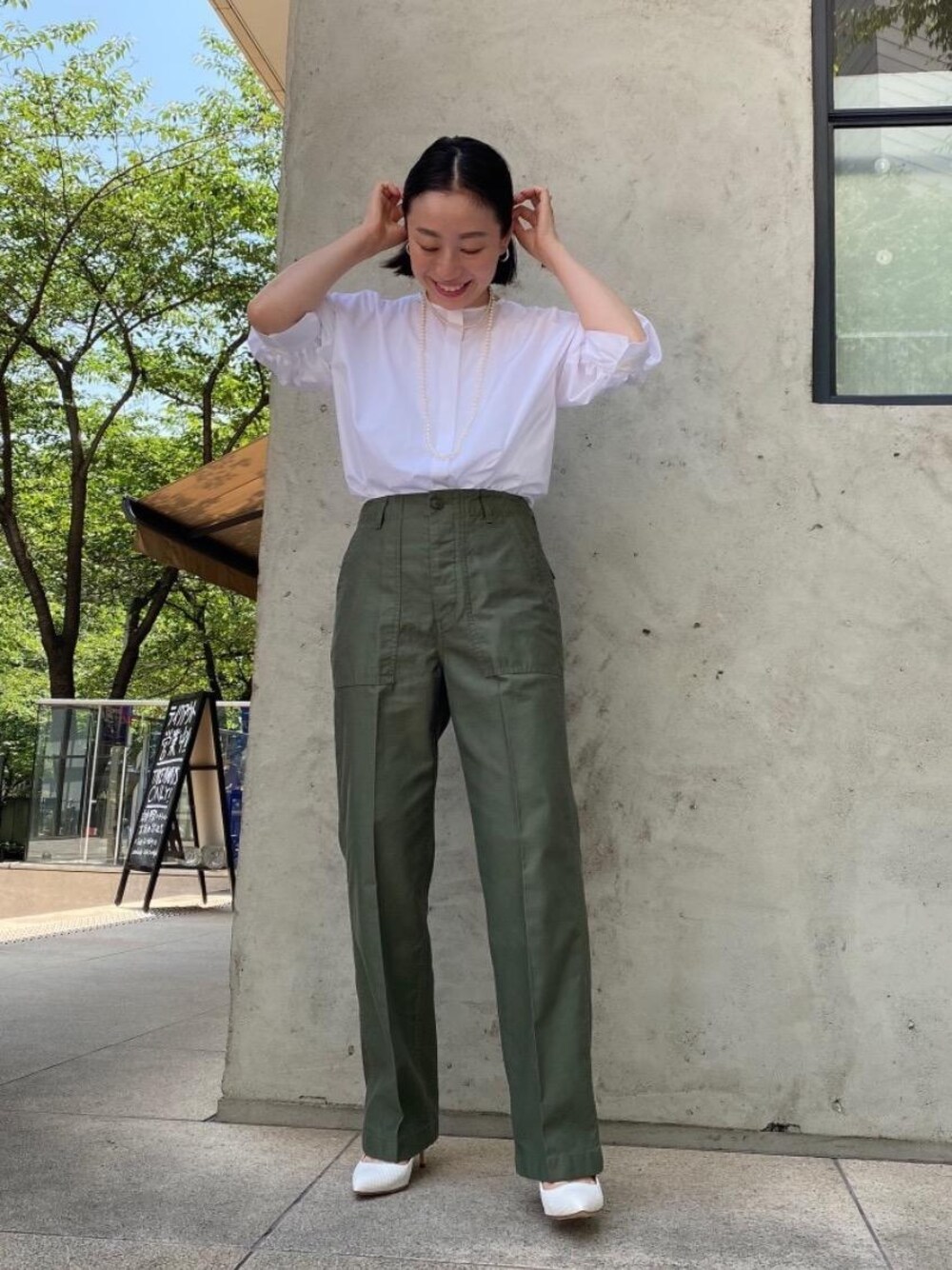 ●身長:153cm ●普段サイズ:シャツ36/パンツ36/シューズ22.5cm 【サイズ感】 ブラウス:ドロップショルダーならではのゆったりとした造りに加えて、ボリューム感たっぷりのお袖が特徴です。 パンツ:標準的なサイズ感。 シューズ:標準的なサイズ感。ウエスト位置が高く腰回りゆったりの、身体のラインが美しく見えるデザインです。 【素材感】【着心地】 ブラウス:サラッとした快適な着心地。 パンツ:ホームケア可能なのでデニム代わりとして、カジュアルな場所にも最適なパンツです。 【コーディネートのポイント】 ベイカーパンツに甘めなデザインのブラウス、パールのネックレスとヒールを合わせ、気軽に楽しめるフェミニンスタイルを表現。 #シャツ/ブラウス #パンツ #アクセサリー #パンプス#フェミニンカジュアル #パール