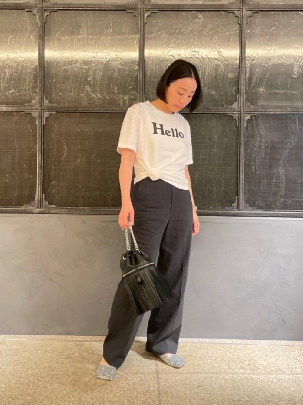 ●身長:153cm ●普段サイズ:トップス36/パンツ36/シューズ22.5cm 【サイズ感】 Tシャツ:標準的ですが着丈は長めです パンツ:標準よりもややゆったりとした造り シューズ:標準的 【素材感着心地】 Tシャツ:ヴィンテージ感のある柔らかく肌馴染みの良い着心地 パンツ:リネン特有のサラッととした手触りがありつつも、柔らかい履き心地。通常サイズで選ばれた場合、腰から腿周りにかけてゆとりが感じられる作りになっております。 シューズ:グリッターを全面に施したフラットシューズです。履き初めやや硬く感じる方もいらっしゃるかもしれませんが、数回の着用でご自身の脚にフィットした履き心地になるかと思います。 【コーディネートのポイント】 シンプルな装いの際は、着方と小物選びで全体にメリハリをつけます。 #Tシャツ #パンツ #アクセサリー #サンダル #リラックス
