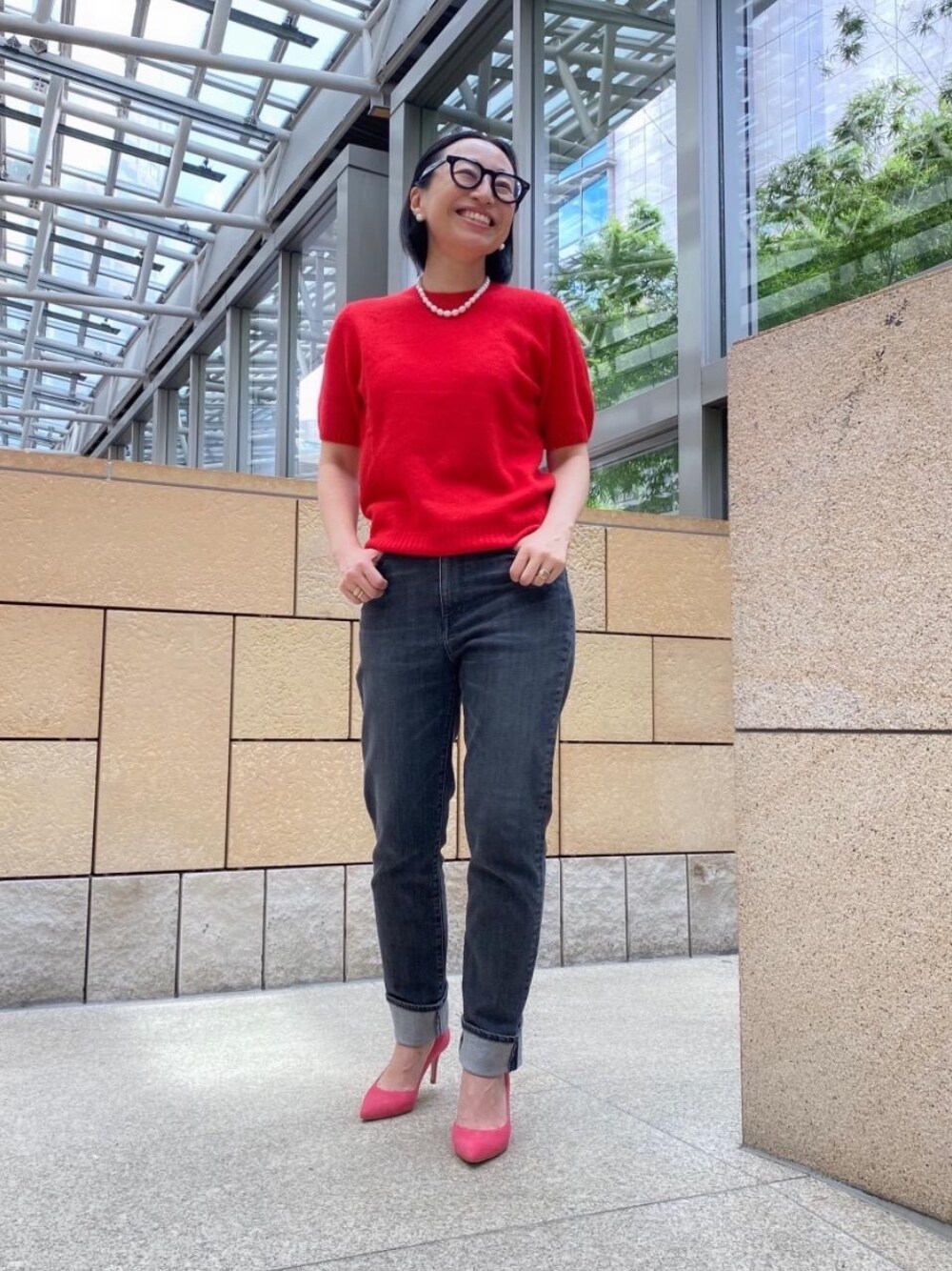 ●身長:153cm ●普段サイズ:トップス36/パンツ36/シューズ22.5cm 【サイズ感】 ニット:着丈はやや短めですが身幅は標準的な作り。 デニム:スキニーデザイン。非常に細身。 シューズ:標準的 【素材感着心地】 ニット:カシミア混特有の柔らかな着心地。 デニム:ストレッチ素材の為非常に柔らかな履き心地。ウエスト周りの締め付けもなくストレスフリーで楽しめます。 パンプス:標準的。 【コーディネートのポイント】 鮮やかな赤とピンク、色の掛け合わせとパールアクセがコーディネートのポイントです。細身すぎないデニムが自分好みの為、今回のスキニーデニムは通常より大きなサイズを選んでおります。 #ニット#デニム#パンプス#パールアクセ