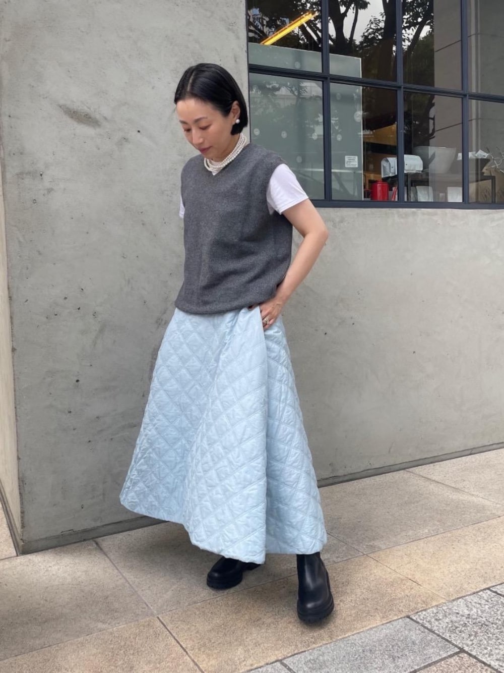 ●身長:153cm ●普段サイズ:シャツ36/スカート36/シューズ22.5cm 【サイズ感】 Tシャツ:コンパクトなサイズ感。インナー使いに最適です。 ベスト:標準的なサイズ感。 スカート:ウエストは標準的なサイズ感。裾にかけて大きく広がるデザインです。 【素材感着心地】 Tシャツ:滑らかな触り心地と肌に優しい着心地。 ベスト:軽さと柔らかな毛質が特徴。全くチクチクしません。 スカート:キルティング特有の軽さがあります。 【コーディネートのポイント】 トレンドのキルティングスカートにニットジレを合わせ秋を意識したコーディネート。ボリュームのあるスカートにはコンパクトなシルエットのトップスがオススメです。 #ベスト/ニットジレ #スカート/キルティングスカート #アクセサリー/パール #サイドゴアブーツ