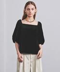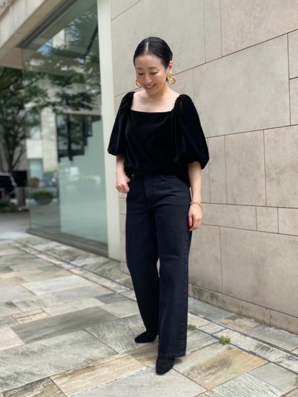 ●身長:153cm ●普段サイズ:トップス36/パンツ36/シューズ22.5cm 【サイズ感】 ブラウス:ボリュームスリーブが特徴のベロアブラウス。デコルテを強調するように大きくスクエアに開いた首元のデザインもポイントです。胸周りは標準的。 パンツ:標準よりもややゆったりとした作り。 シューズ:標準的。 【着心地】 ブラウス:ベロアの滑らかな肌触りと軽い着心地はまさに初秋にぴったりのアイテムです! デニム:程よくワイドなシルエット。 【コーディネートのポイント】 トレンドのベロア素材を用いたボリュームスリーブの トップスにブラックデニムを合わせたコーディネー ト。オールブラックの装いにボリュームのあるゴール ドアクセサリーで華やかさをプラス。足元はスタイルアップを兼ねてヒールのショートブーツを。 #シャツ/ブラウス #パンツ #アクセサリー #リラックス
