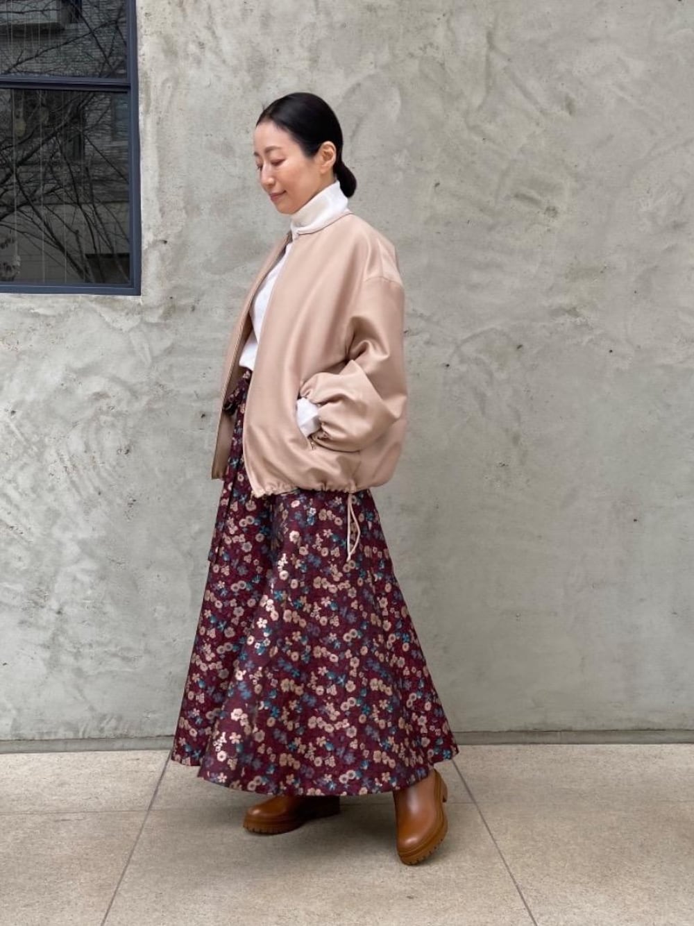 ●身長:153cm ●普段サイズ:スカート36/ブルゾン36/ブーツ36 【サイズ感】 スカート:ウエストは標準的ですが着丈は長めです ニット:着丈長めです ブルゾン:ビックシルエット。たっぷりとした着丈とサイズ感が特徴 ブーツ:標準的 【コーディネートのポイント】 梅春を意識してのコーディネート。1枚で主役級のスカートにはシンプルなトップスを用いるのが個人的にオススメのスタイルです。全体の色のトーンを合わせることで、個性的な要素も不思議と品よくまとまります。