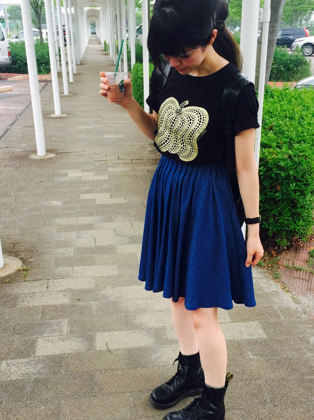 草間彌生コラボのUTー かわいい! 今日はこれが着たかったのだー Tシャツに合わせて時計とピンもゴールドで! ギラギラーーー なんかみょーーに脚が白く写っちゃったけど、ストッキングは履いてませんから!