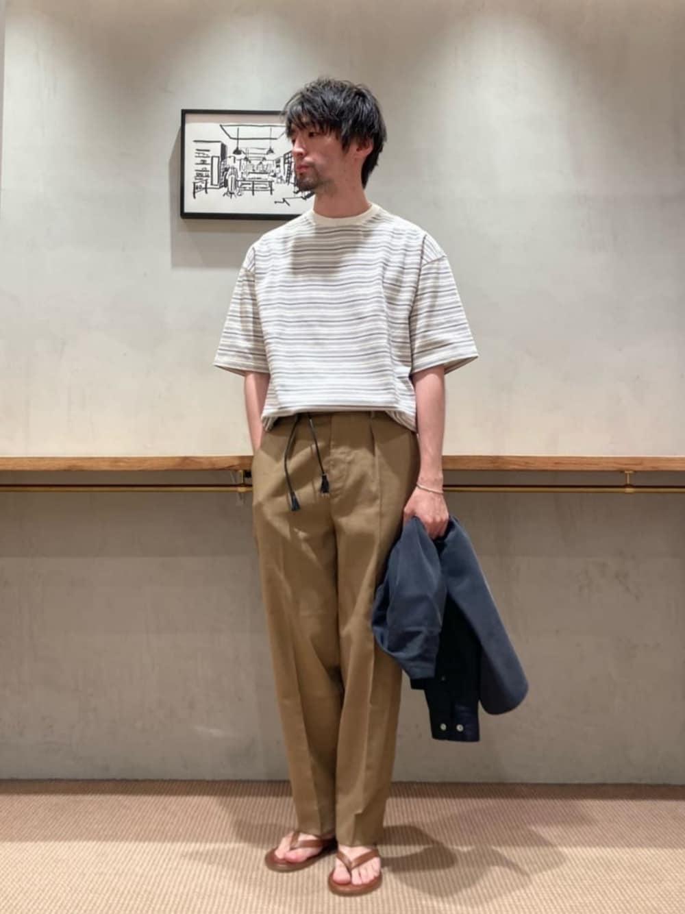 【サイズ】 シャツ:Mサイズ・ゆったり カットソー:Mサイズ・ゆったり パンツ:Sサイズ・ゆったり シューズ:41・ジャスト 【コーディネート】 stevenalan定番のボーダーTEEは様々なスタイリングで合わせていただけるのでおすすめです。 今回は落ち着いた色のパンツと合わせて、ベーシックなスタイリングにしてみました。 シャツをシルク素材を選んだり、特徴のあるベルトを選んでバランスをとってます。