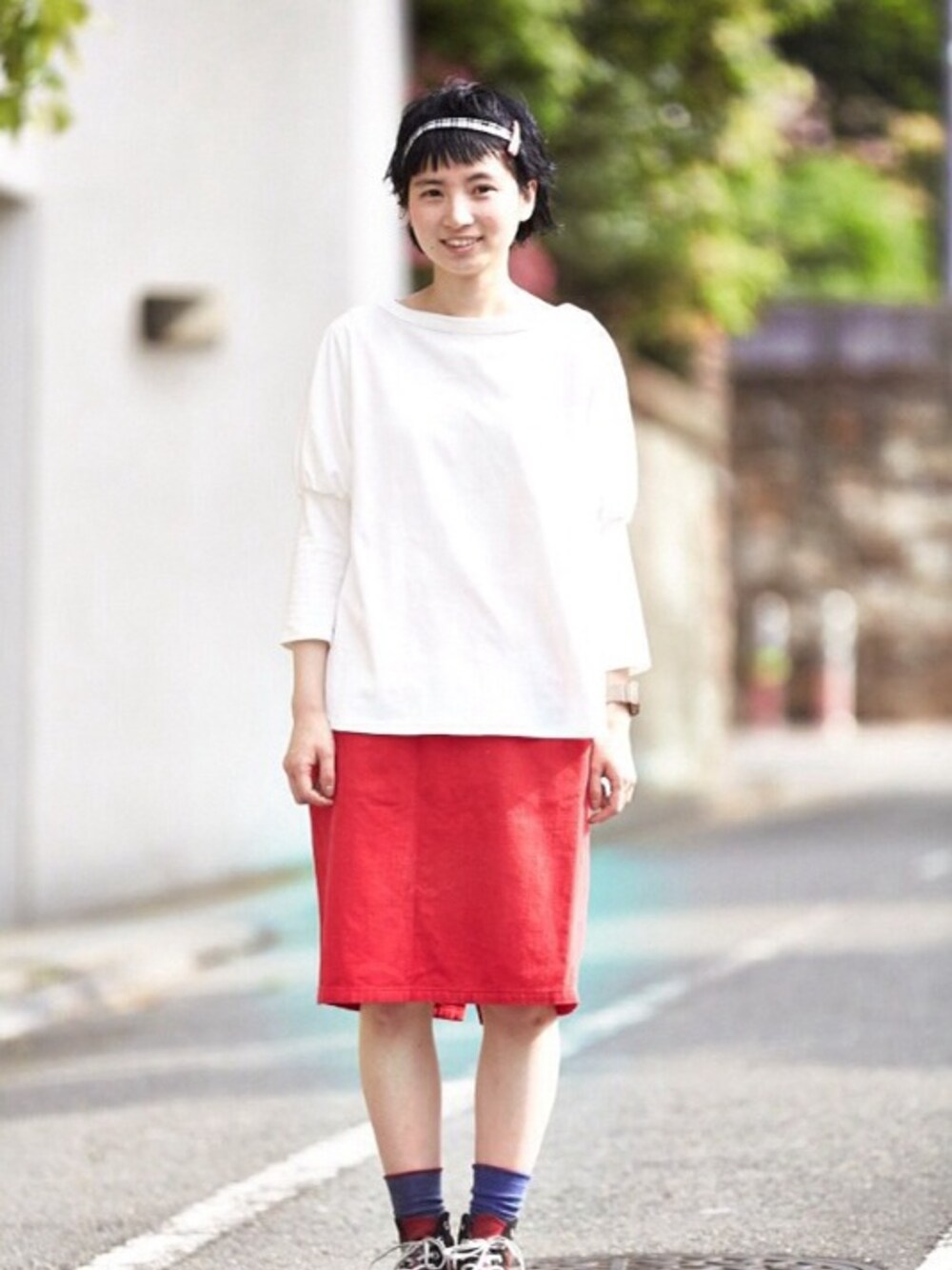 ハッとするようなきれい色のスカートが今日の主役。と言ってもキメキメにするのではなく、ゆるシルエットのトップスをラフに重ねた外国人の女の子っぽいさりげなさが気分です。髪型はあえて寝ぐせっぽくクシャッとさせて、リボンバレッタを目立たせました。ふだんからメイクもほとんどしません。もさもさの眉毛もお気に入りです。