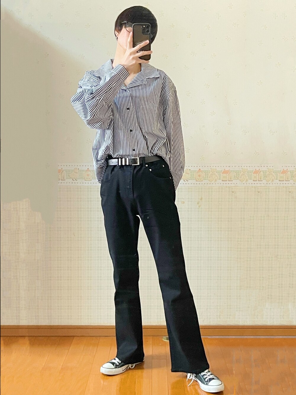 人生初のフレアパンツ そして、ちゃっかりとADRERの最新作 「ドルマンスリーブオープンカラーシャツ(ストライプ)」