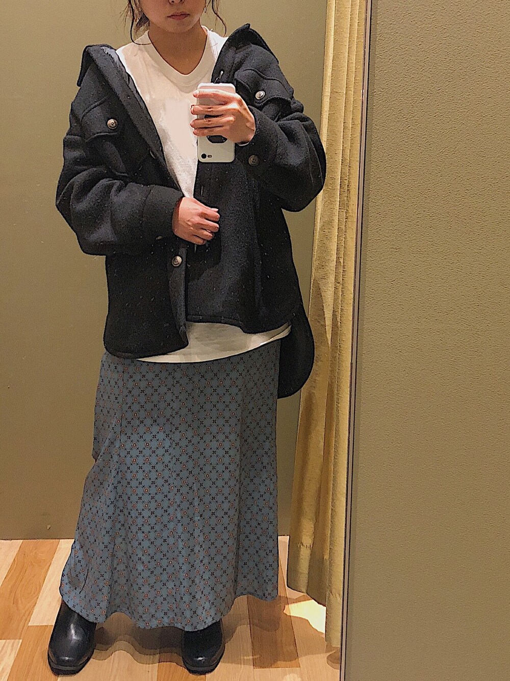 【モードコーデ】 流行りのCPOはearthだけでなくGreenParksからも発売されております ! earthはふわふわ感のあるジャケットでしたが GreenParksはしっかりとした厚手のジャケットです! そんなCPOとコモン柄のロングスカート.ショートブーツと合わせてみました ! どちらもじわじわと流行りのアイテムになっております ♡