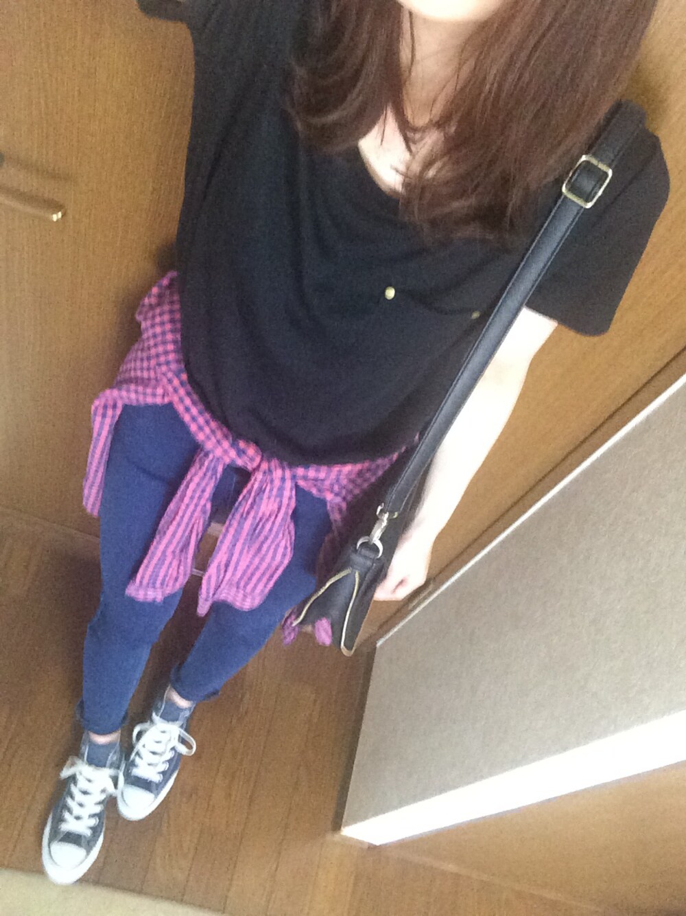 カジュアル\(^o^)/ ハイカットコンバース♡ ネイビー\(^o^)/ 赤チェックシャツもかなり使ってる^^