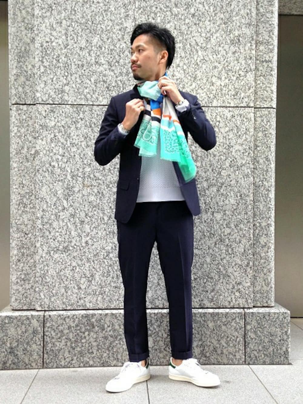 春夏のスーツ素材といえばモヘア混。今回はそのモヘア混のジャケットとパンツのセットアップを、ネイビー&ホワイトのシンプルなカラーコーディネートで休日スタイルに仕上げました。このシンプルコーディネートには色鮮やかなストールが必須! 風によって表情が変わる華やかな柄で、春をより一層楽しめます。