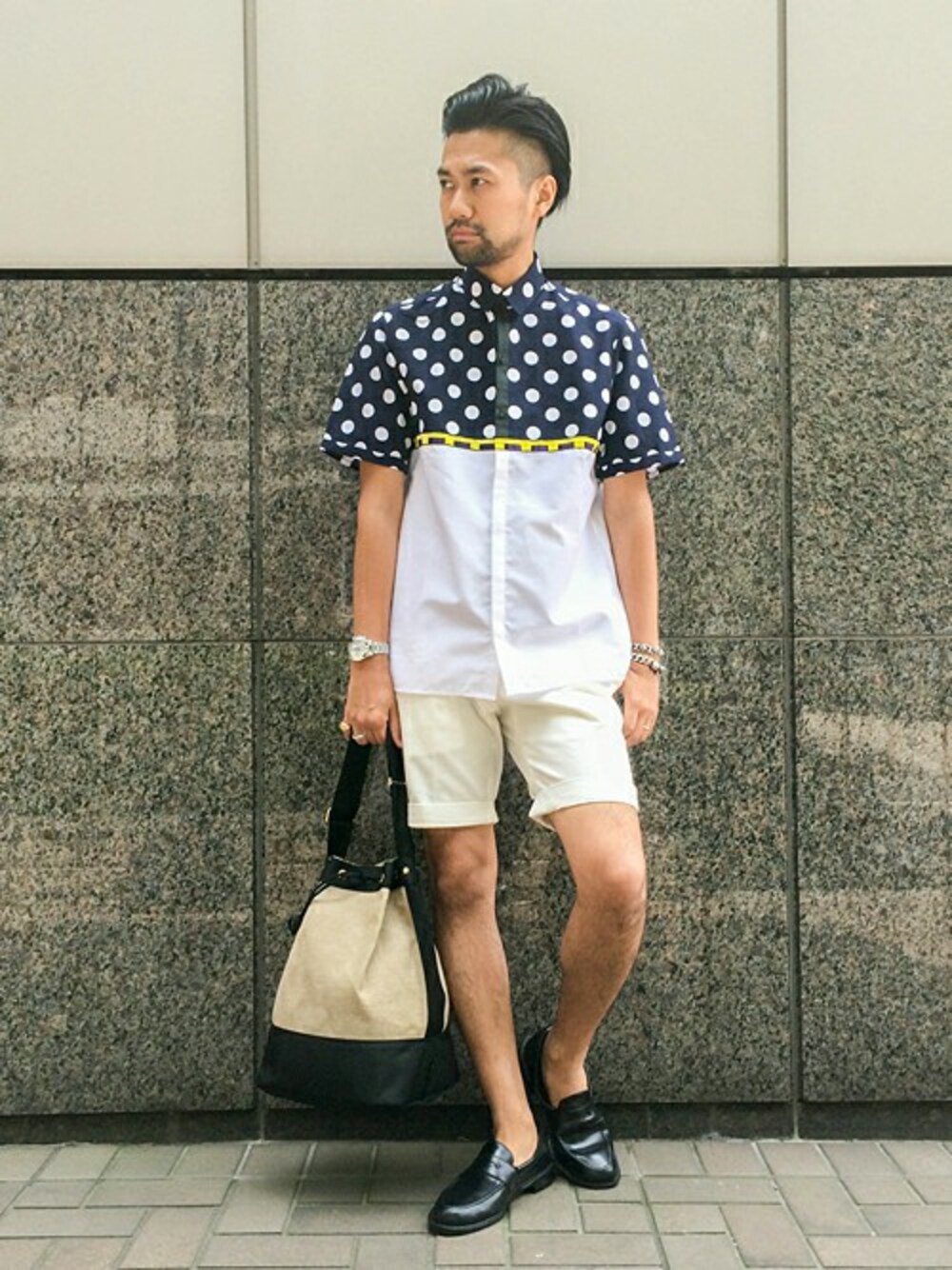 今回は梅雨をハッピーに過ごせるコーディネートをご提案させていただきます。胸のあたりで切り替えになっている<LAURENCE AIRLINE>の半袖シャツは、雨を連想させるような大きいドットのデザインがなんだか楽しい気分にさせてくれます。全体の色味をネイビーとホワイトで構成することで、大人っぽくさわやかな印象になります。また足下も雨仕様の一品。全体をPVCで仕上げたローファーなので、雨の日でも濡れるのを気にせず行動できます。さあこの時期だからこそ、着ていて楽しくなる洋服をぜひともトライしてみてください。